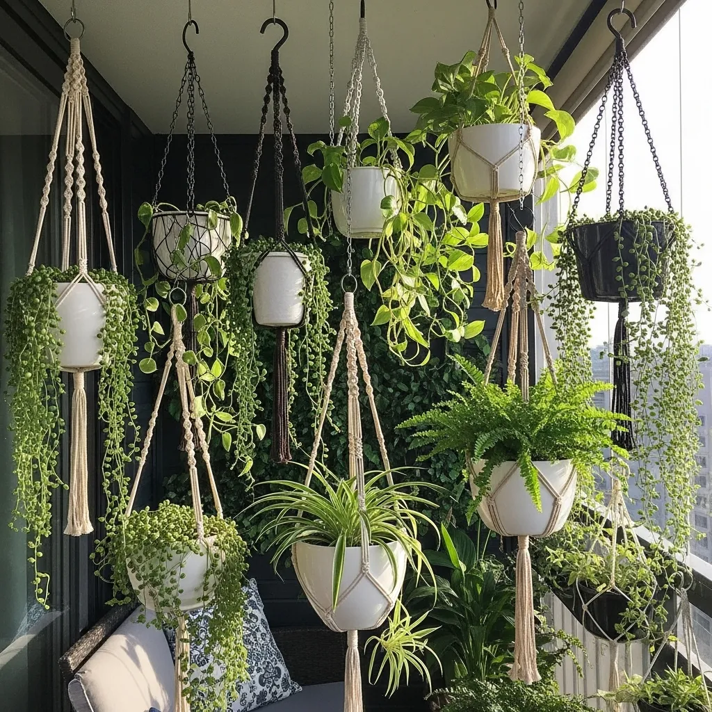 Hanging planters maximize vertical space while adding layers of greenery that transform balconies into lush garden sanctuaries. Install ceiling hooks rated for weight-bearing to safely support plants, water, and container weight, spacing planters at varying heights to create dimensional visual interest rather than a flat, uniform line. Choose trailing plants that grow downward toward the floor, creating living curtains that provide natural privacy screening, soften hard architectural lines, and improve air quality. This approach works especially well for narrow balconies where floor and railing space is limited but overhead area remains unused, essentially doubling your gardening capacity without sacrificing square footage.