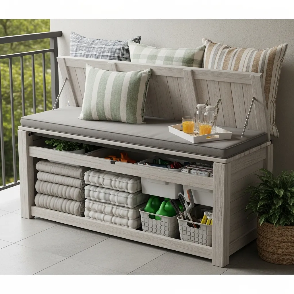 Storage benches solve multiple balcony challenges simultaneously by combining essential seating with concealed storage for items that clutter small spaces. Choose weather-resistant materials like resin wicker, sealed wood, or waterproof fabric over a sturdy frame that withstands seasonal temperature fluctuations and occasional moisture exposure. Use interior space to store outdoor cushions during bad weather, gardening supplies, extra throw blankets, small tools, toys, or anything currently taking up valuable floor or indoor closet space. The bench top provides additional seating when hosting guests or serves as a surface for setting drinks, books, or decorative elements when not occupied.
