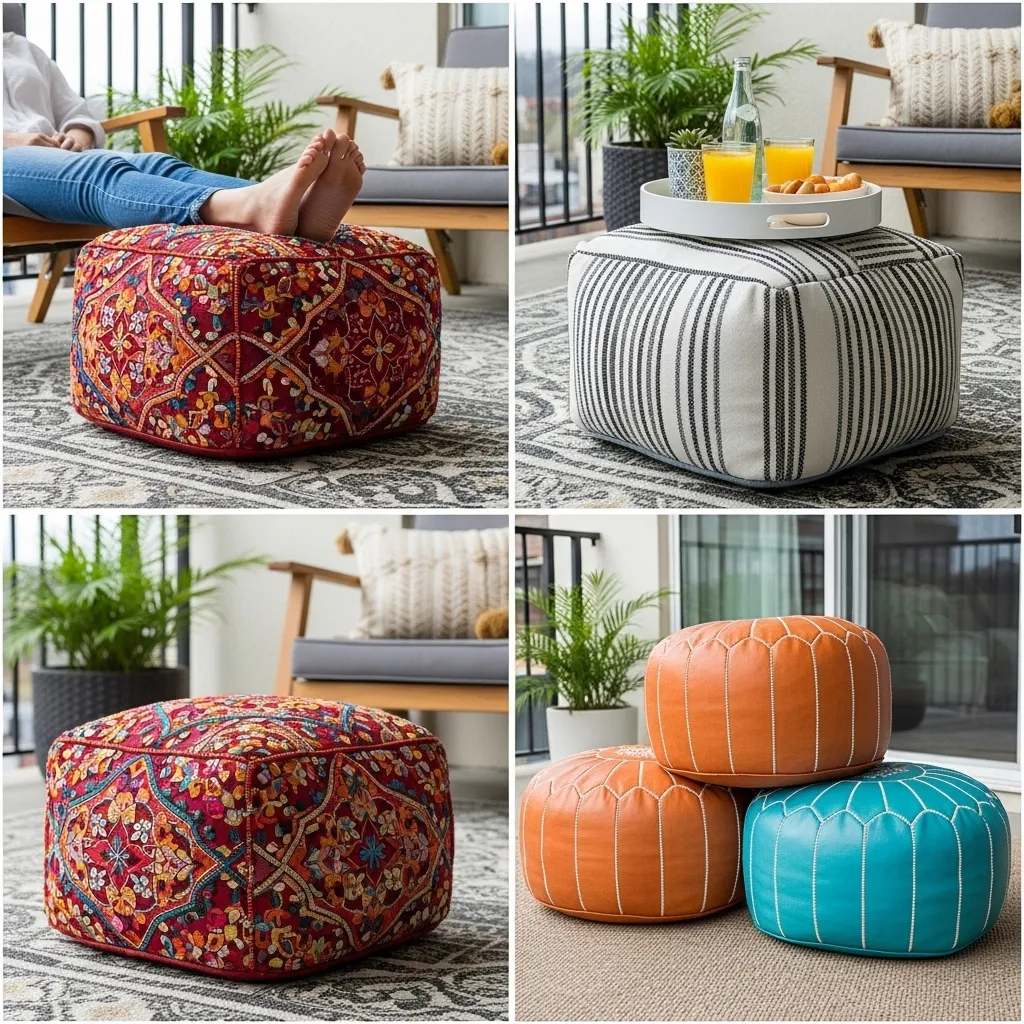 Poufs add flexible, space-efficient functionality to balconies by serving as footrests, extra seating, side tables with trays, or decorative accents depending on current needs. Choose outdoor-rated poufs with water-resistant covers and quick-drying filling, or opt for indoor poufs you’re willing to bring in after use if you prefer softer materials and more color options. These lightweight, portable pieces move easily around your balcony as needs change throughout the day or when transitioning from solo use to entertaining guests. The low-profile design doesn’t block views or create visual clutter like traditional furniture, making poufs especially valuable on small balconies where every piece must earn its space through multiple functions.