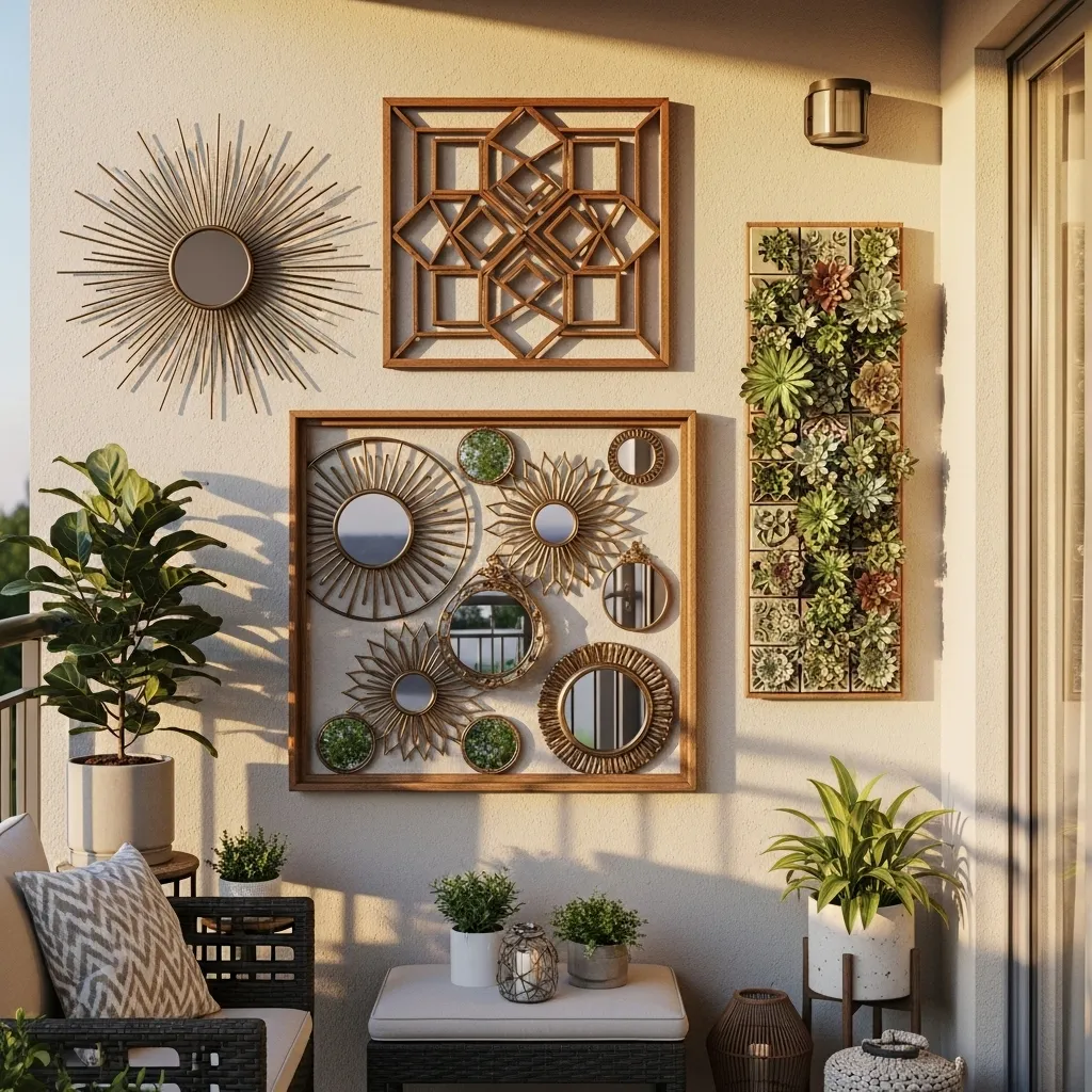 Outdoor wall art transforms blank balcony walls into designed focal points that express personal style and elevate the entire space from functional to inspirational. Choose pieces specifically rated for outdoor use or protect indoor art with weatherproof frames and covered balcony positioning away from direct rain exposure. Metal sculptures, sealed wood pieces, mosaic tiles, and outdoor-rated prints withstand elements while adding visual interest to vertical surfaces that often go ignored in balcony decorating. Scale art appropriately to your wall size, choosing one large statement piece or creating gallery walls with multiple smaller complementary works that tell a cohesive visual story.
