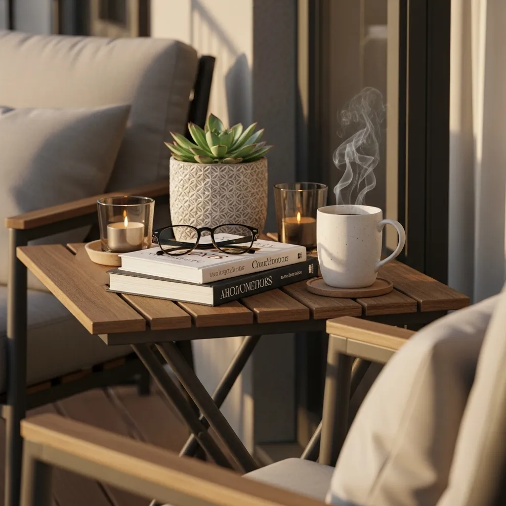 The difference between having and lacking a proper side table dramatically affects balcony comfort and usage frequency. Without convenient surfaces, you’re constantly holding drinks, balancing books awkwardly, or making trips inside for basic needs, creating friction that discourages outdoor time. Side tables establish your balcony as a complete, self-sufficient space where you can settle in comfortably for extended periods without compromise. Choose styles that complement your overall aesthetic while prioritizing stability – lightweight tables tip easily in wind, creating frustration and potential breakage. This relatively small investment removes a major usability barrier and signals that your balcony is a finished, thoughtfully considered space rather than an afterthought furnished with leftovers.