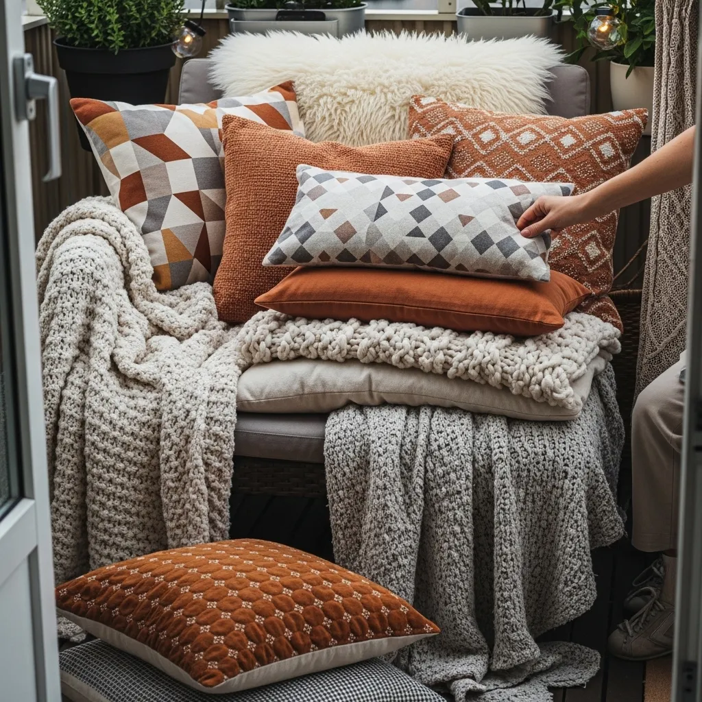 Textile layering elevates basic outdoor furniture into irresistible cozy nooks that draw you outside regardless of weather conditions. Start with weather-resistant base cushions, then layer throw pillows in varying sizes, textures, and patterns to add visual interest and lumbar support. Add lightweight outdoor throws that can be pulled over shoulders during cool evenings, choosing quick-drying materials or bringing textiles inside after use to extend their lifespan. This layered approach allows easy seasonal updates by swapping pillow covers and throws without replacing major furniture pieces, keeping your balcony looking fresh and reflecting current style preferences without significant expense.