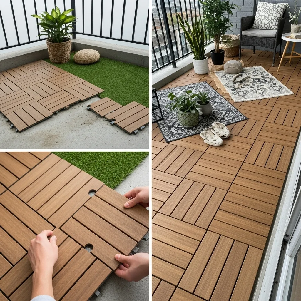 Modular deck tiles revolutionize balcony floors without permanent installation or damage to rental properties. These interlocking squares snap together over existing concrete surfaces, instantly upgrading appearance while remaining completely removable when you move. Choose from wood-composite tiles that mimic hardwood decking, artificial grass squares for a garden feel, stone-look tiles for a patio aesthetic, or rubber tiles for slip resistance and cushioning. Installation requires no tools or expertise – simply start in one corner and click tiles together like puzzle pieces until your entire floor is covered, cutting edge pieces with a utility knife if needed for perfect fit.