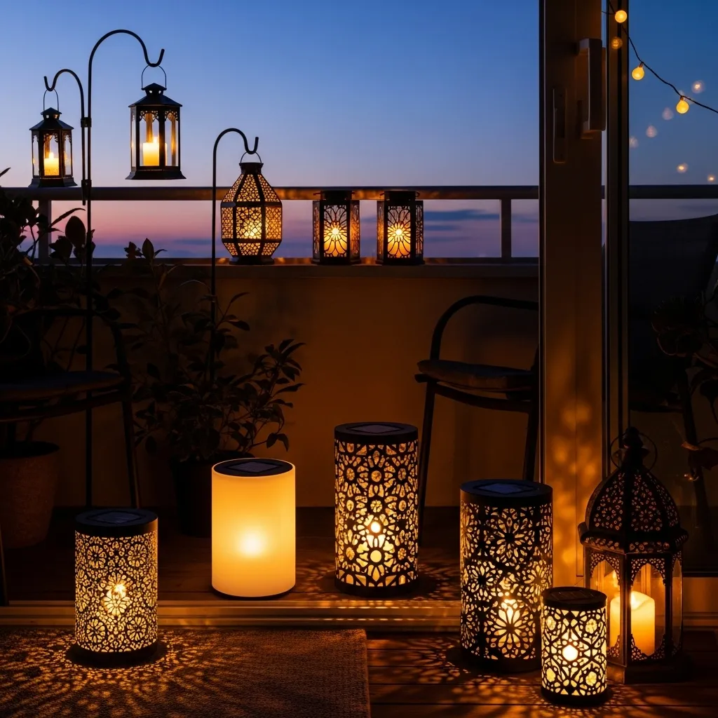 Solar lanterns provide romantic ambient lighting without electrical requirements, making them ideal for balconies without convenient outlet access. These self-sufficient fixtures charge during daylight hours and automatically illuminate at dusk, creating effortless atmosphere that welcomes you home each evening without switches or timers. Choose from traditional metal lanterns with cutout designs, modern minimalist cylinders, colorful glass options, or rustic wooden styles based on your aesthetic preferences. Place lanterns at varying heights using shepherd hooks, railing hangers, table surfaces, and floor positions to create layered lighting that feels designed and intentional rather than flat or harsh.