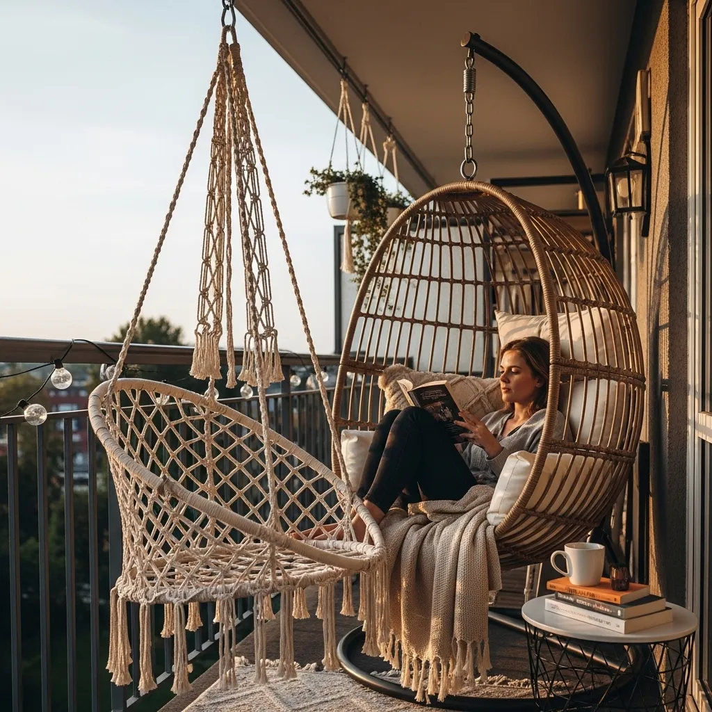 Hanging chairs create an instant focal point and conversation piece while providing the most comfortable, cocooning seating option available for balconies with adequate ceiling support. Verify your balcony ceiling can support the weight by consulting building management or a professional before installation, as most require drilling into concrete or securing to load-bearing beams. Choose from bohemian macramé styles, modern egg chairs, traditional hammock chairs, or swing-style seats based on your aesthetic preferences and comfort priorities. Add weather-resistant cushions and throw pillows to increase comfort and protect the chair material from weather exposure when not actively in use.