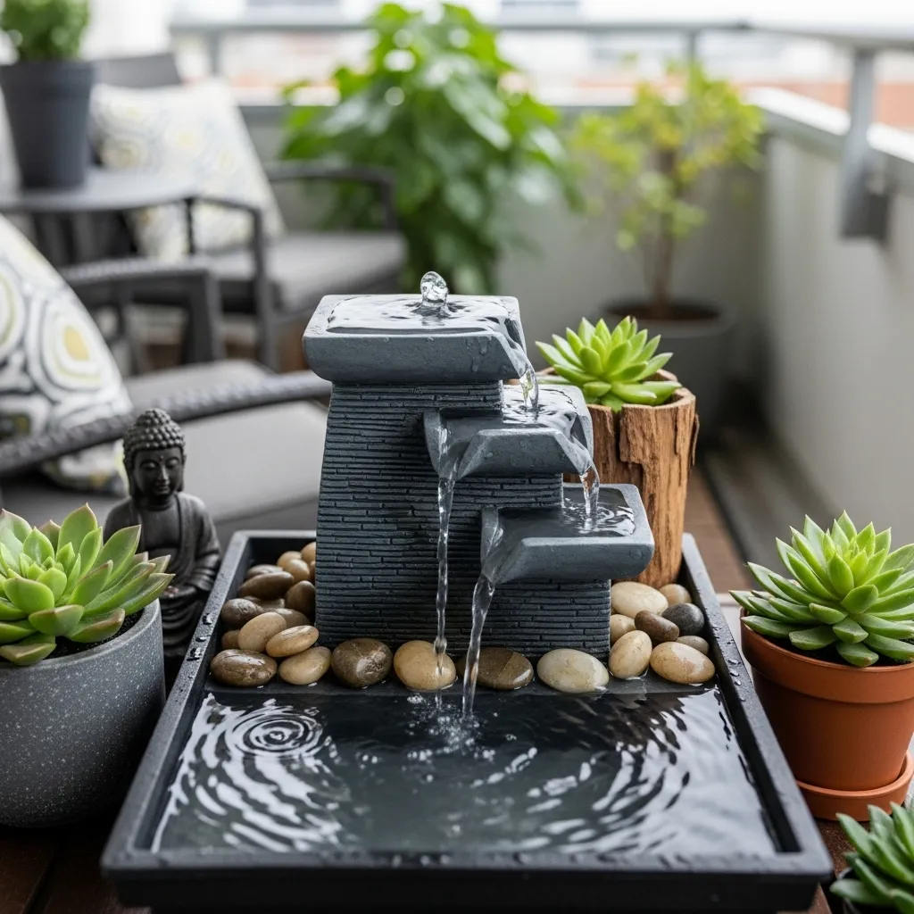 Water fountains introduce soothing natural sounds that mask urban noise pollution while creating a zen-like atmosphere on your balcony. Small tabletop models require minimal space and investment, with most costing between thirty and eighty dollars and operating on standard electrical outlets or solar power. The gentle trickling sound provides white noise that helps you mentally disconnect from traffic, sirens, neighbors, and city chaos, transforming your balcony into a meditation-worthy retreat. Position fountains on sturdy side tables, corner shelves, or dedicated plant stands where they become focal points without interfering with traffic flow or seating areas.