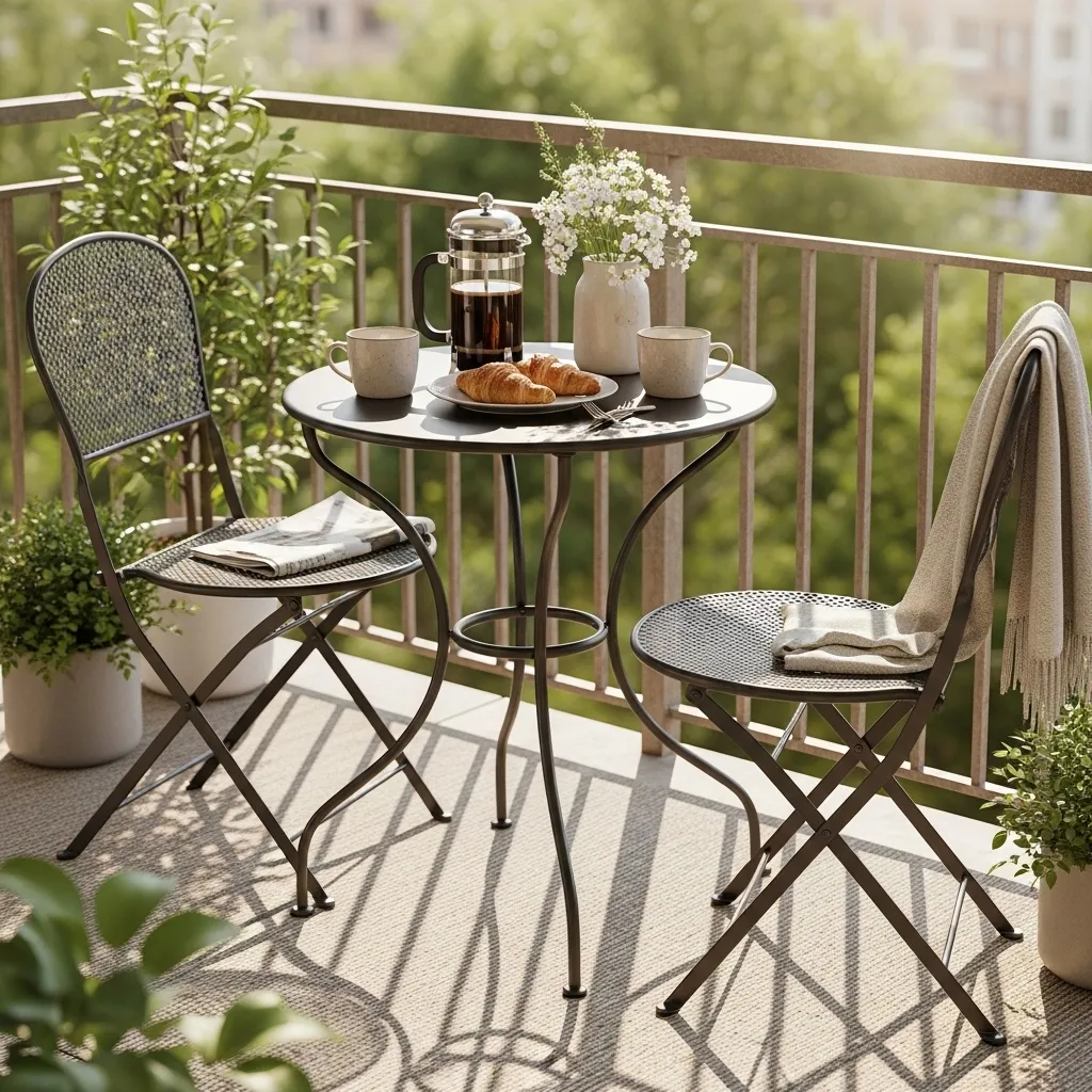Investing in a properly scaled bistro set transforms your balcony from decorative space to functional living area where you’ll actually spend time. Choose folding metal designs that can be collapsed and stored during harsh weather or when you need floor space for other activities. The classic two-chair, one-table configuration provides everything needed for morning coffee, outdoor meals, working remotely with a view, or evening wine sessions with a friend. Metal options withstand weather better than wood, dry quickly after rain, and typically cost less while maintaining that charming European cafe aesthetic that never goes out of style.