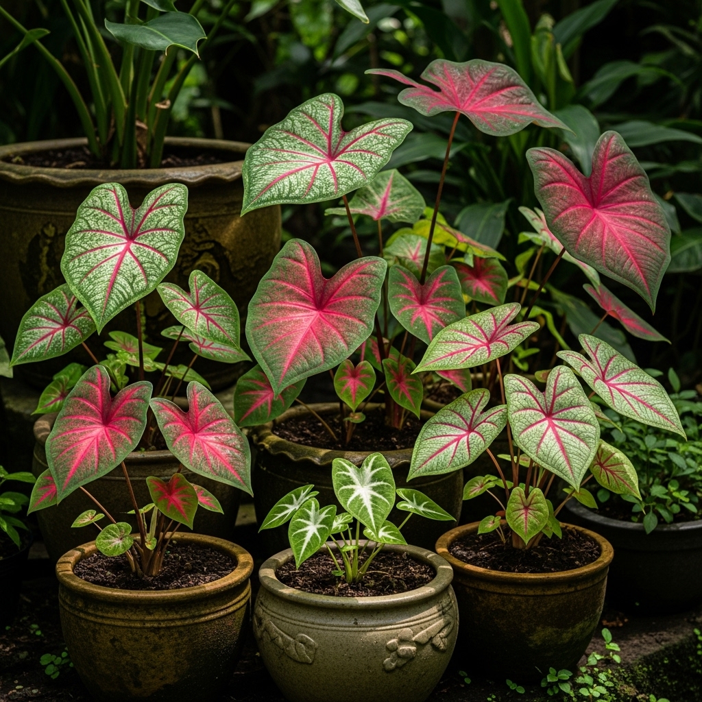 These plants prefer warm temperatures and moist soil, making them ideal for sheltered patios and shaded garden beds. When combined with neutral planters or greenery, caladiums create striking contrast and visual interest throughout the growing season.
