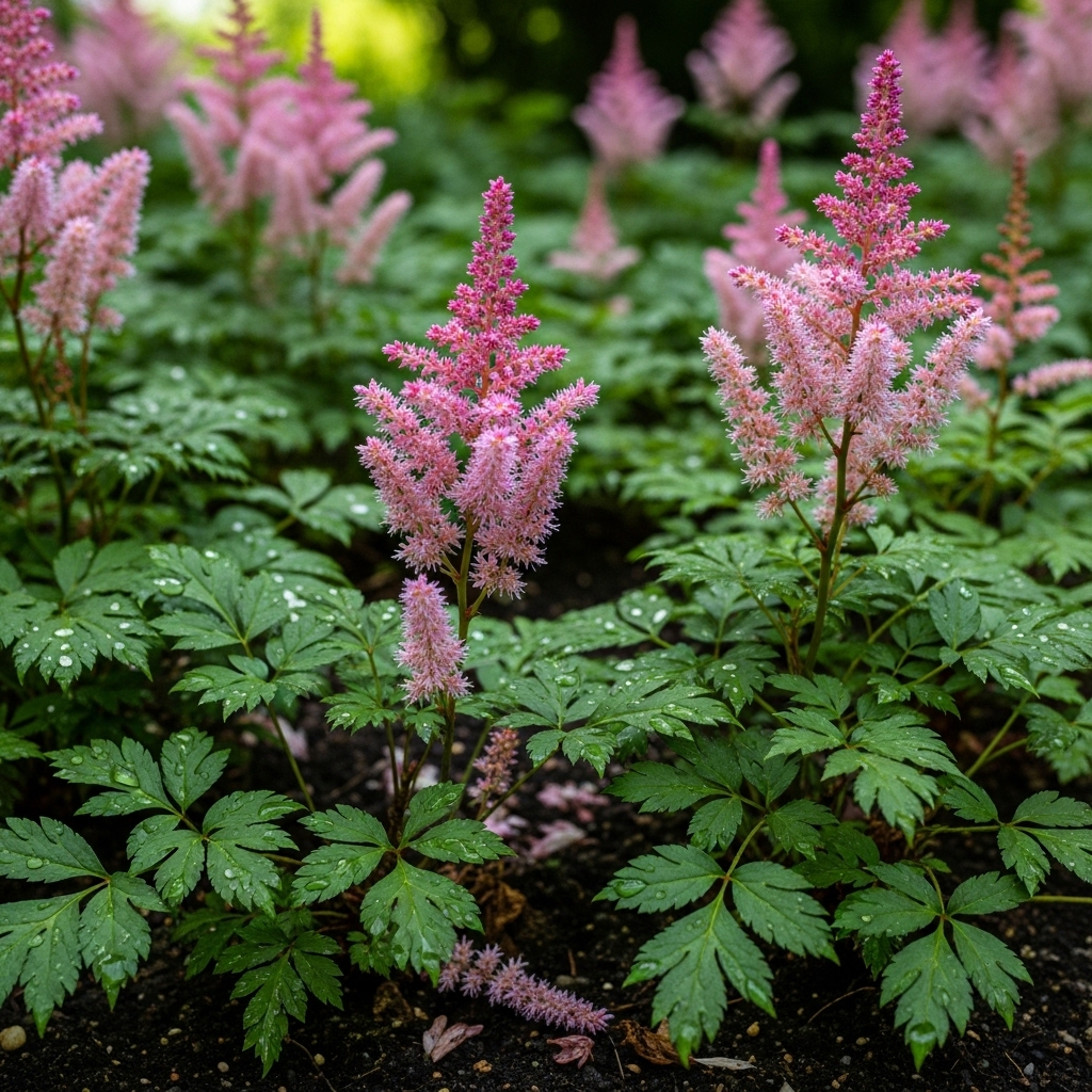Astilbe is a flowering plant that thrives in shaded, north-facing outdoor spaces. Its plume-like flowers add height and softness, creating visual contrast among leafy plants. Astilbe prefers moist soil and indirect light, making it perfect for shaded gardens.