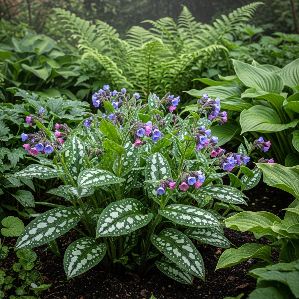 Pulmonaria is a shade-loving plant that thrives in north-facing outdoor gardens. Its spotted foliage adds unique texture, while early spring flowers bring gentle color. This plant performs well in cool, shaded conditions.