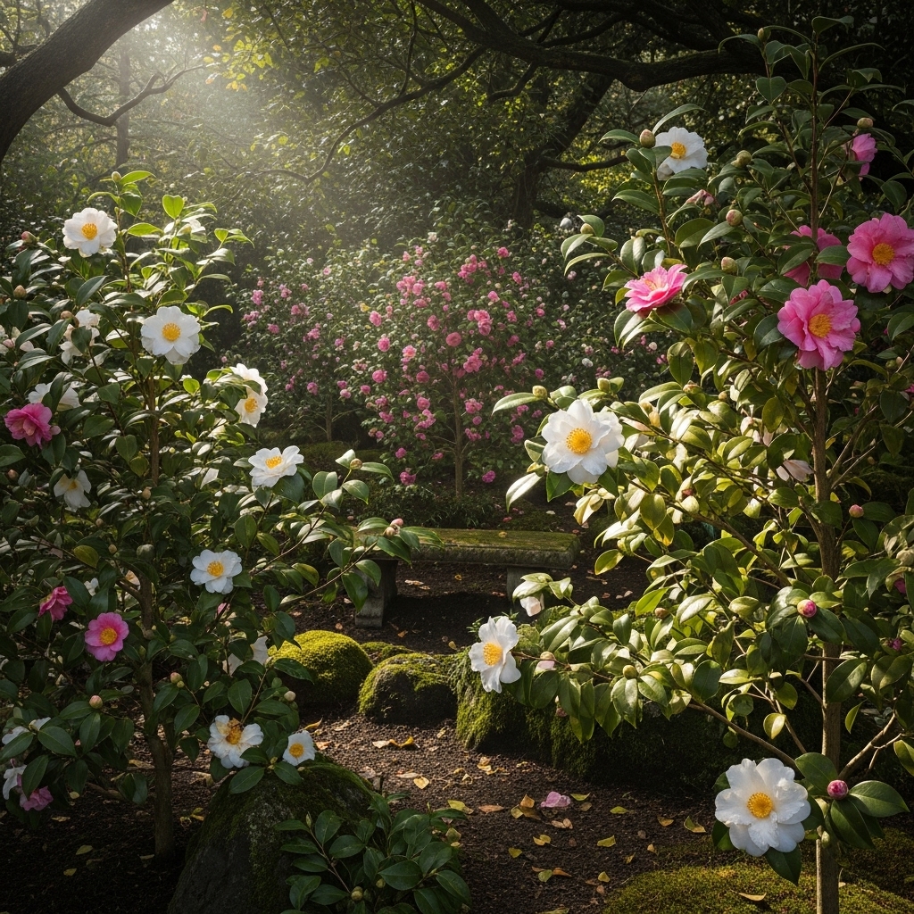 Camellias grow well in north-facing outdoor spaces where they are protected from harsh sunlight. Their glossy foliage and refined blooms add sophistication to shaded gardens. Camellias prefer cool, sheltered environments.